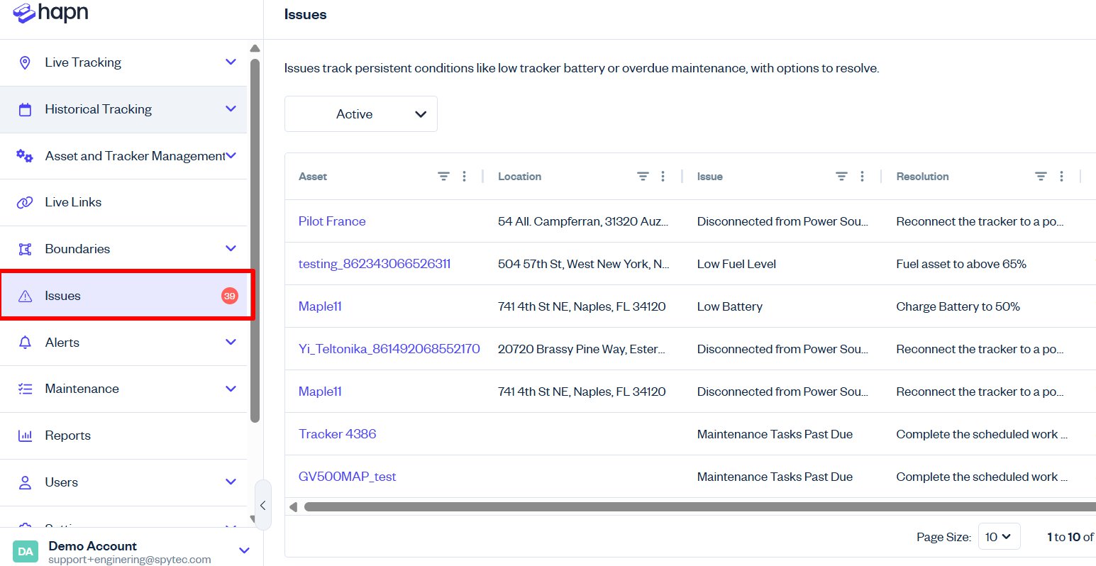 Issues are active problems with your assets and trackers that require your attention right now. Think of it as your action list—only problems that need fixing are shown. If everything is working normally, you won't see it listed.